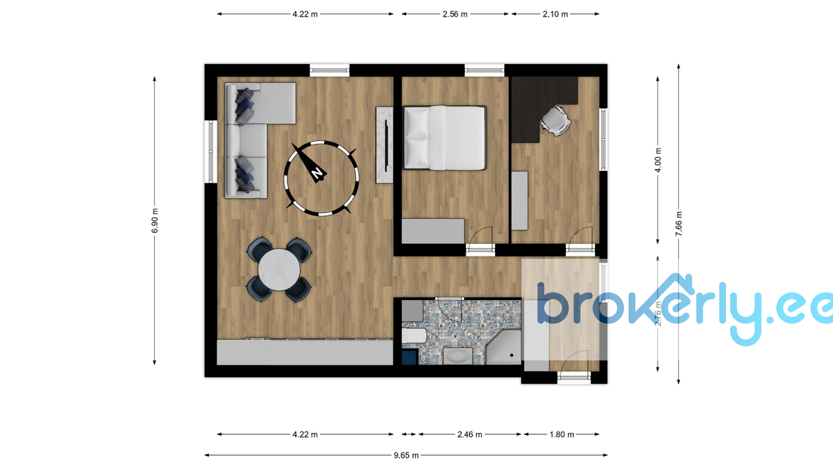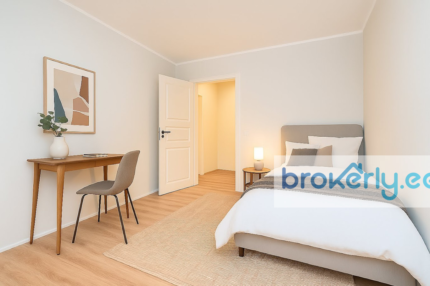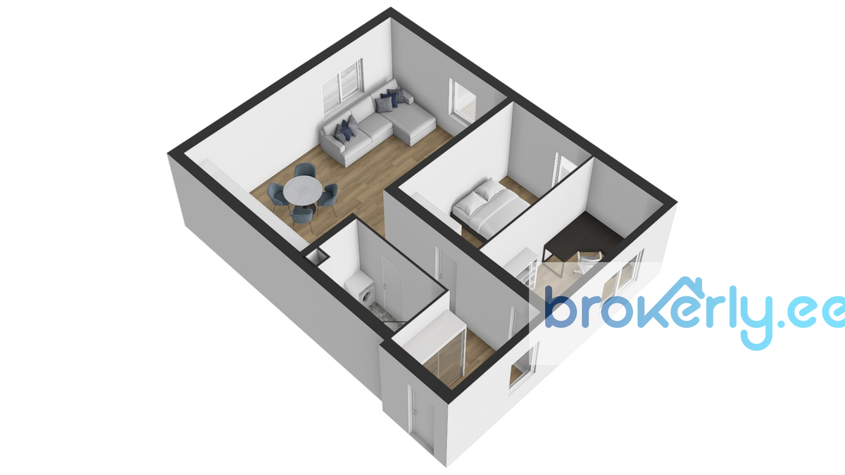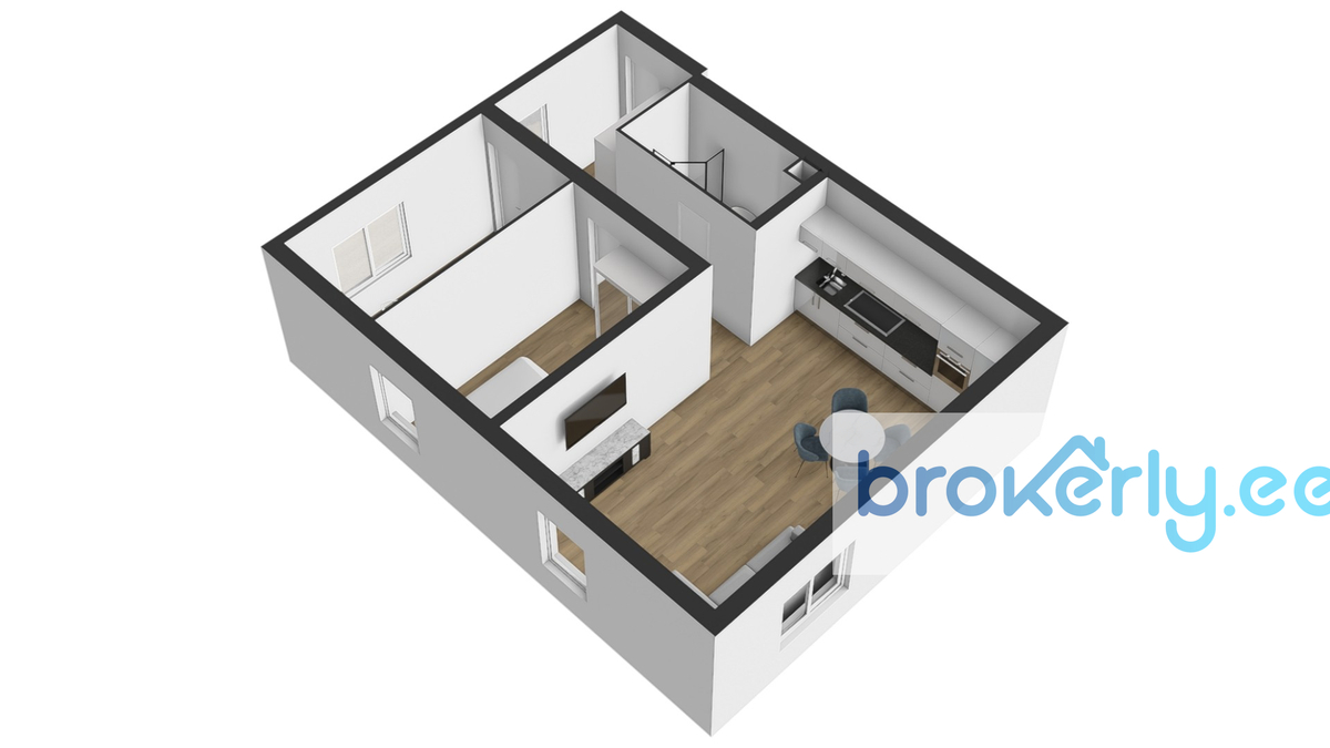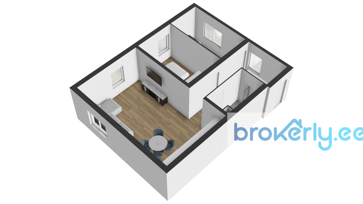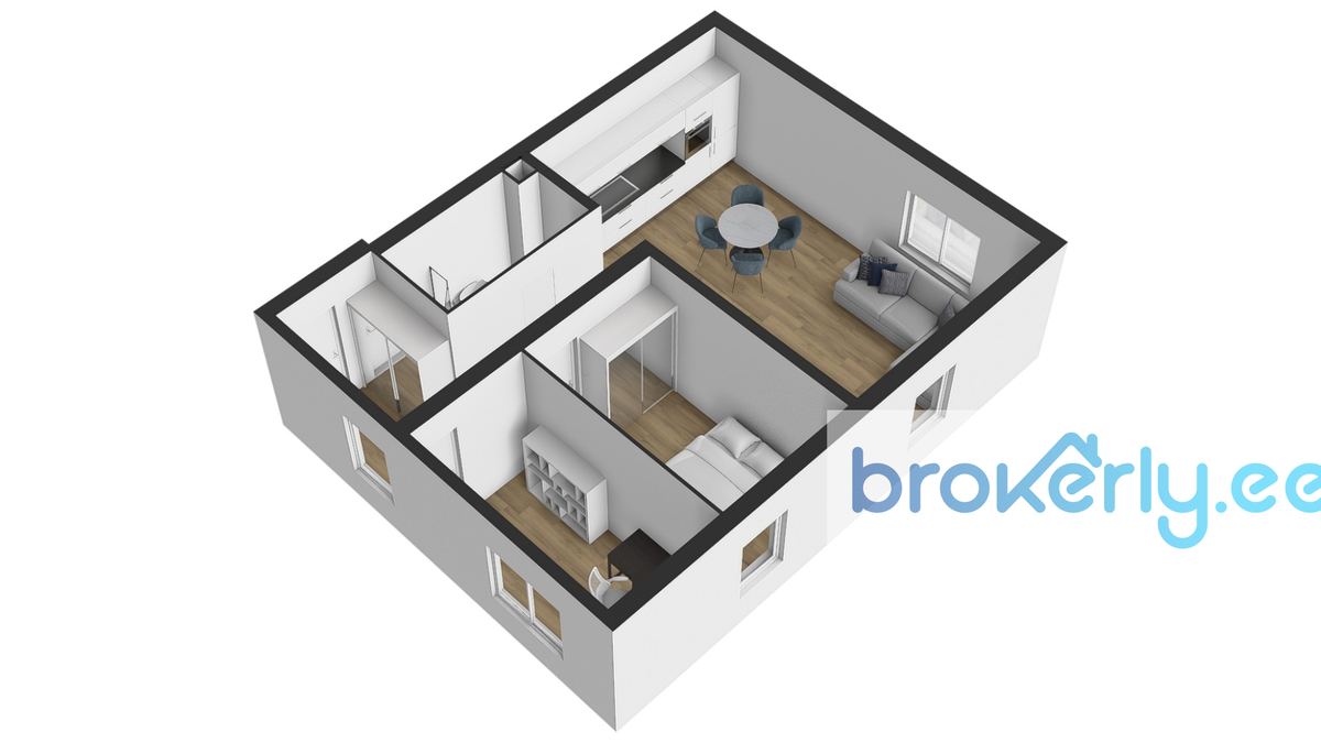 Уютная и тёплая квартира площадью 60,8 м² расположена на 2-м этаже 3-этажного дома. Планировка включает кухню-гостиную, две спальни, ванную комнату и встроенный шкаф в прихожей. Окна выходят на северо-восток и юго-восток, квартира светлая. Дом находится во дворе, поэтому внутри очень тихо.